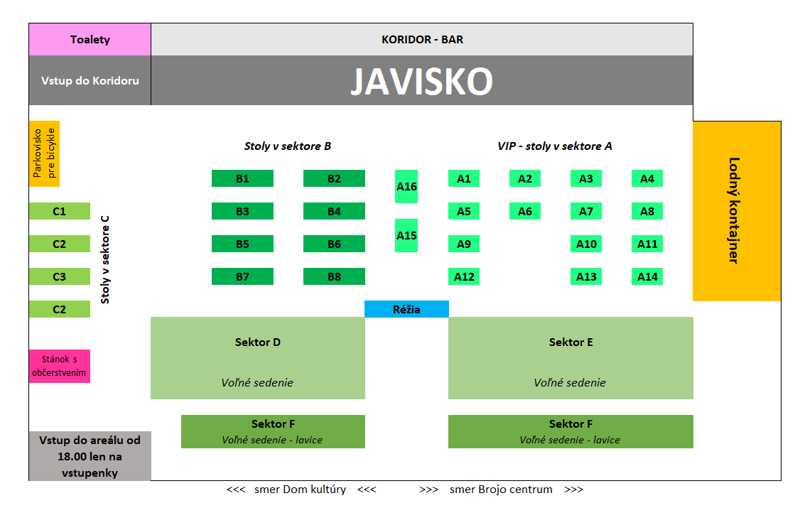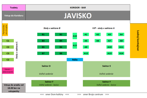 Vstupenky je možné zakúpiť cez internet v tomto článku nižšie alebo na bare v kaviarni Koridor. Hľadisko bude rozdelené do sektorov nasledovne: