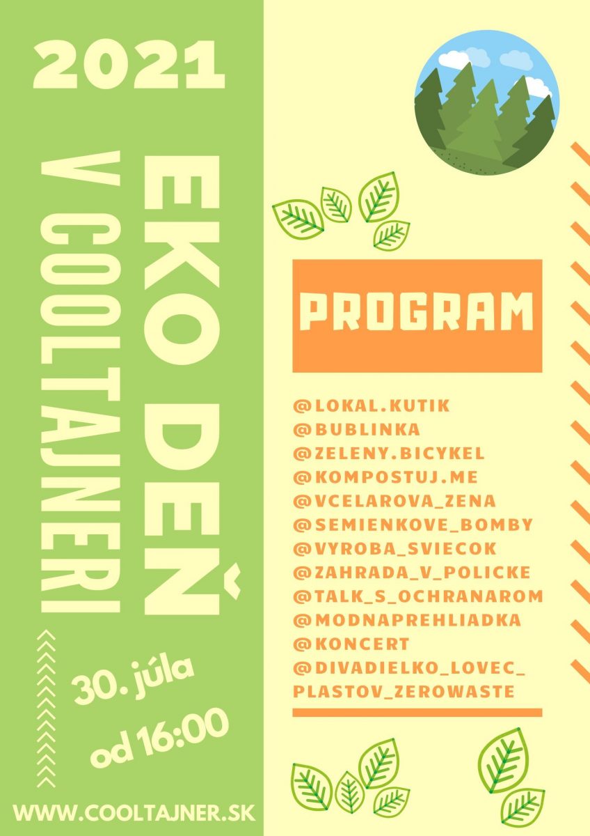 Príďte 30. 7. 2021 od 16.00 do KC Cooltajner na deň venovaný ochrane prírody. Čaká na vás bohatý program s ekologickými témami, stánky, kde si budete môcť kúpiť zaujímavé výrobky, divadielko pre najmenších, módna prehliadka, koncert či diskusie s odborníkmi na rôzne témy. Tento rok privítame napríklad: