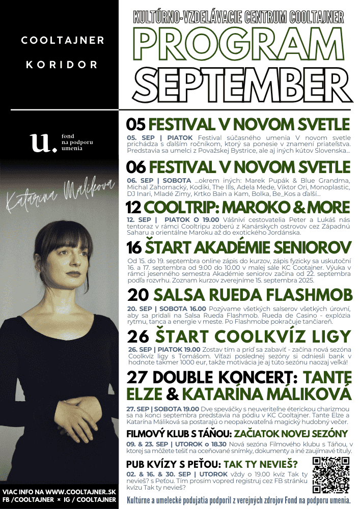 Pozývame vás na septembrový program v kultúrno-vzdelávacom centre Cooltajner.