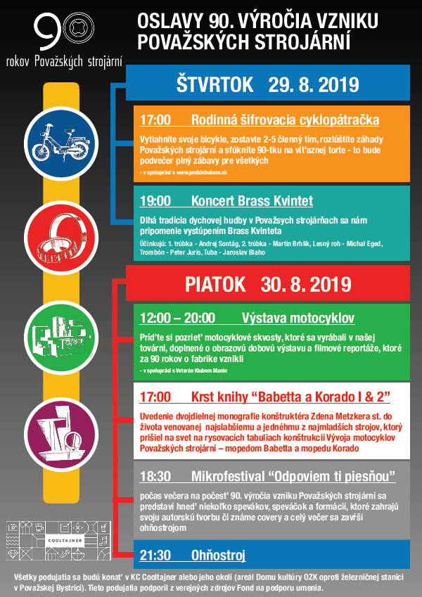 My vás v týchto dňoch pozývame do Cooltajneru na oslavy 90. výročia vzniku Strojární, ktoré si chceme pripomenúť dvojdňovým podujatím. Nebude chýbať zábava pre rodiny s deťmi, ani pre Strojárne tak typická dychovka, tentokrát však v modernejšom prevedení. Čaká však na vás aj výstava toho, čo kedysi bolo klenotom tohto podniku – niekoľkých druhov motocyklov, ktoré vzišli z liniek Strojární, dobové výstavy, príjemné rozhovory, veľa hudobných vystúpení a napokon sme si pre vás pripravili aj ohňostroj.