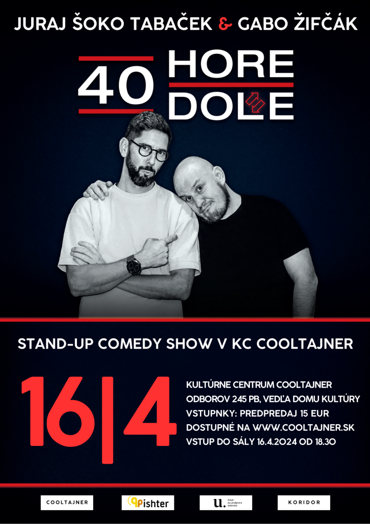 V apríli sa v kultúrnom centre Cooltajner predstaví aj dvojica komikov Juraj „Šoko“ Tabaček a Gabo Žifčák so svojou vlastnou šou 40 hore dole. Vstupenky si môžete zakúpiť v predpredaji prostredníctvom portálu Ticketportal>>