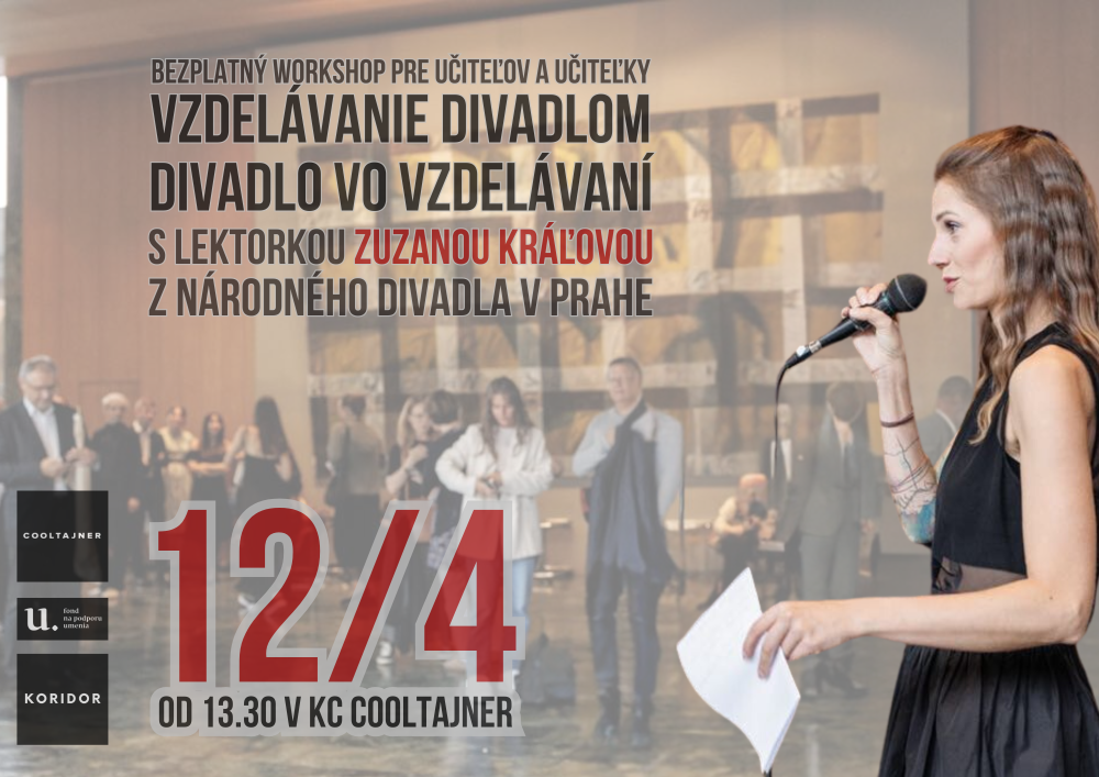 Kultúrno-vzdelávacie centrum pripravilo na piatok 12. apríla 2024 vzdelávací workshop pre učiteľov a učiteľky s lektorkou Národného divadla v Prahe Zuzanou Kráľovou, ktorý je bezplatný. Nevyhnutnosťou je však registrácia vopred prostredníctvom formulára nižšie.
