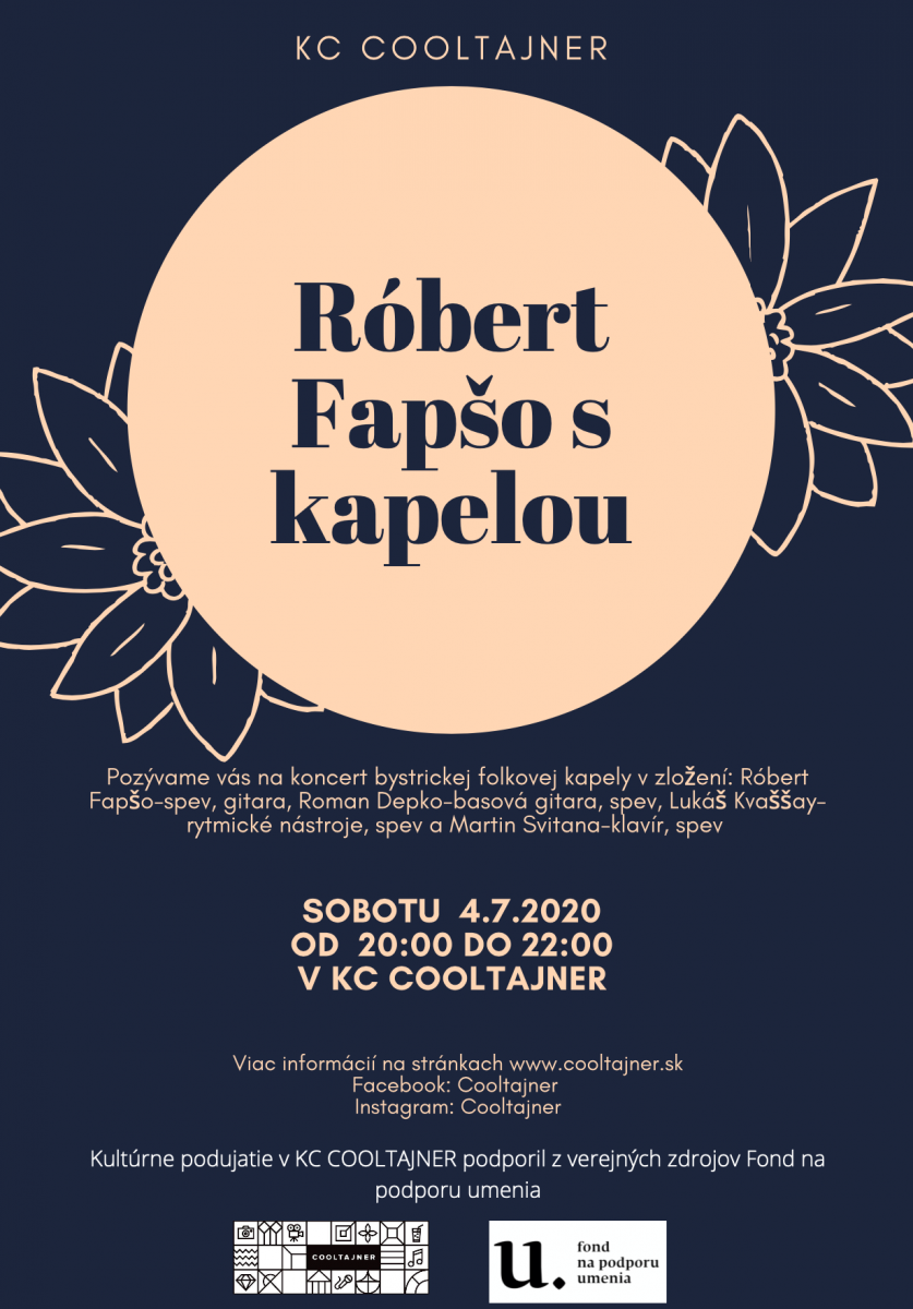 Folkový spevák Róbert Fapšo s kapelou sa opäť predstaví v KC Cooltajneri. Štvorčlenná zostava hrajúca piesne v rodnom jazyku, ktoré majú z pôvodného folkového charakteru prienik do jazzu, funku či popu vás pohltí svojou krásnou energiou a naladí na prázdninovú vlnu už v sobotu 4. júla 2020 o 20:00.